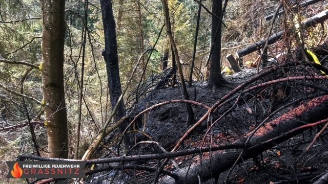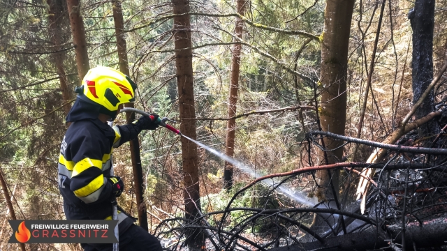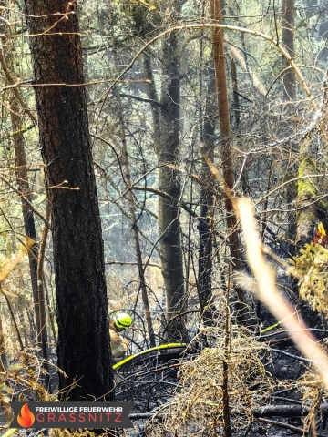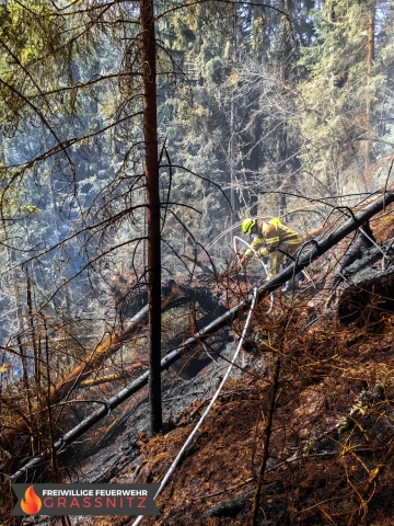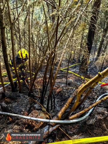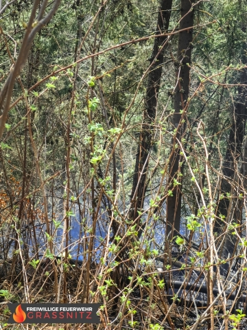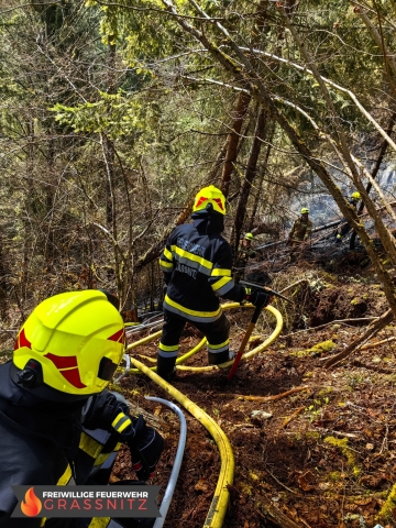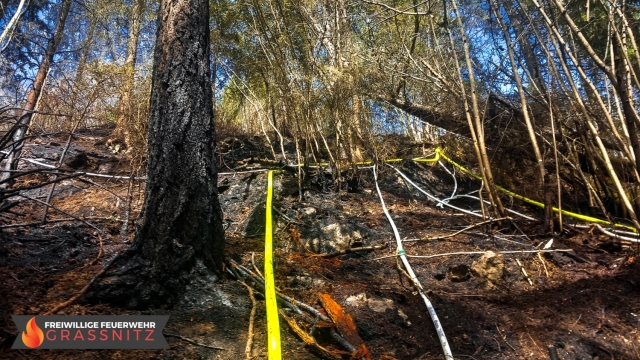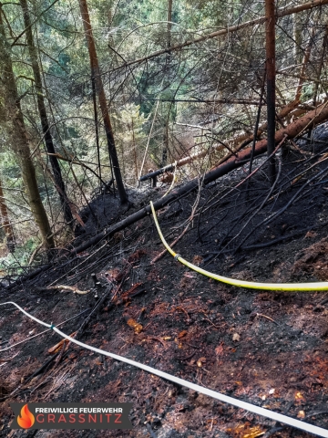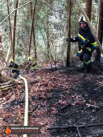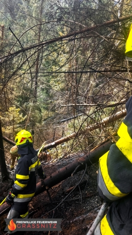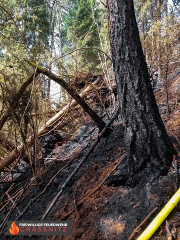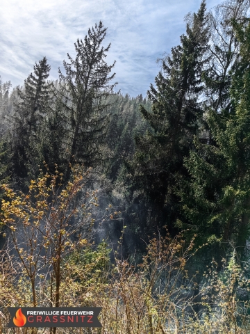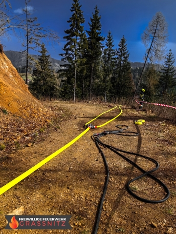 Vermutlich durch einen umgestürtzten Baum auf eine Oberleitung entzündete sich ein Waldabschnitt. Aufgabe der Feuerwehr Grassnitz war es, den Wassertransport zu dem abgelegenen Einsatzort mittles Peldelvehrkehr sicherzustellen, sowie Glutnester zu lokalisieren und diese zu löschen. Dies gestaltete sich aufgrund des steilen Gefälles als sehr schwierig.